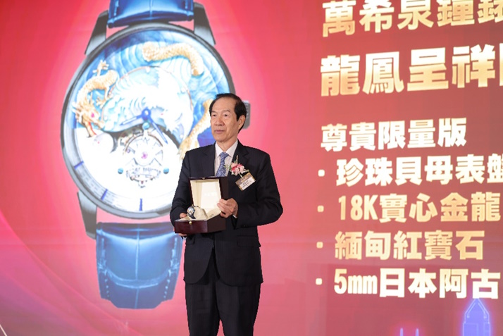 (万希泉钟表有限公司捐出「龙凤呈祥陀飞轮腕表」限量版手表,由中国侨联副主席、香港侨界社团联会主席、 中国和平统一促进会香港总会理事长、十一ˎ十二届全国政协外事委员会副主任、十一届全国工商联副主席卢文端博士以38,800港元成功投得。)