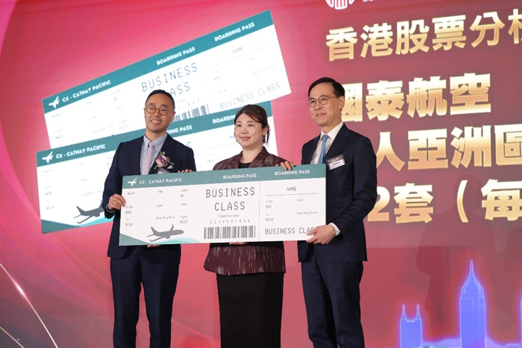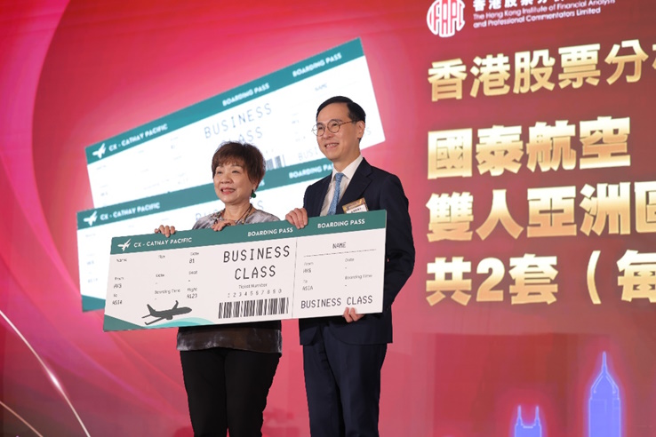 (香港股票分析师协会捐出两套国泰航空双人亚洲区来回商务客舱机票,第二套由资遇财富管理行政总裁陈家轩先生(左)及比元家族办公室首席营运官李瑶女 士(中)以50,000港元成功投得。)