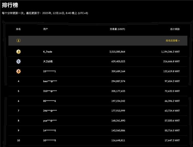 该活动自 11 月 26 日上线以来,吸引全球用户积极参与,交易热度持续攀升。据 WEEX 官网数据,截至 12 月 16 日 18:00 (UTC+8),「合约挖矿」排行榜前 100 的用户累计合约交易量达 91.72 亿美元,累计获得挖矿奖励 3,015,047.7 枚 WXT(数据持续更新中)。
